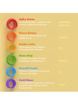 ✅ Stymulacja sensoryczna – różne faktury (kolce, wypustki, fale, gładkie powierzchnie) dostarczają przyjemnych doznań dotykowych.